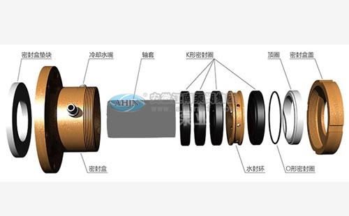 填料密封:又稱為k型動(dòng)力密封 k型密封組合是一套k型動(dòng)力密封的統(tǒng)稱,如下圖,整套密封組合包含:密封盒、密封盒蓋、軸套、k形密封圈、水封環(huán)、頂圈、o形密封圈、密封盒墊塊以及冷卻水嘴。(不同規(guī)格型號(hào)的泵密封略有差異)